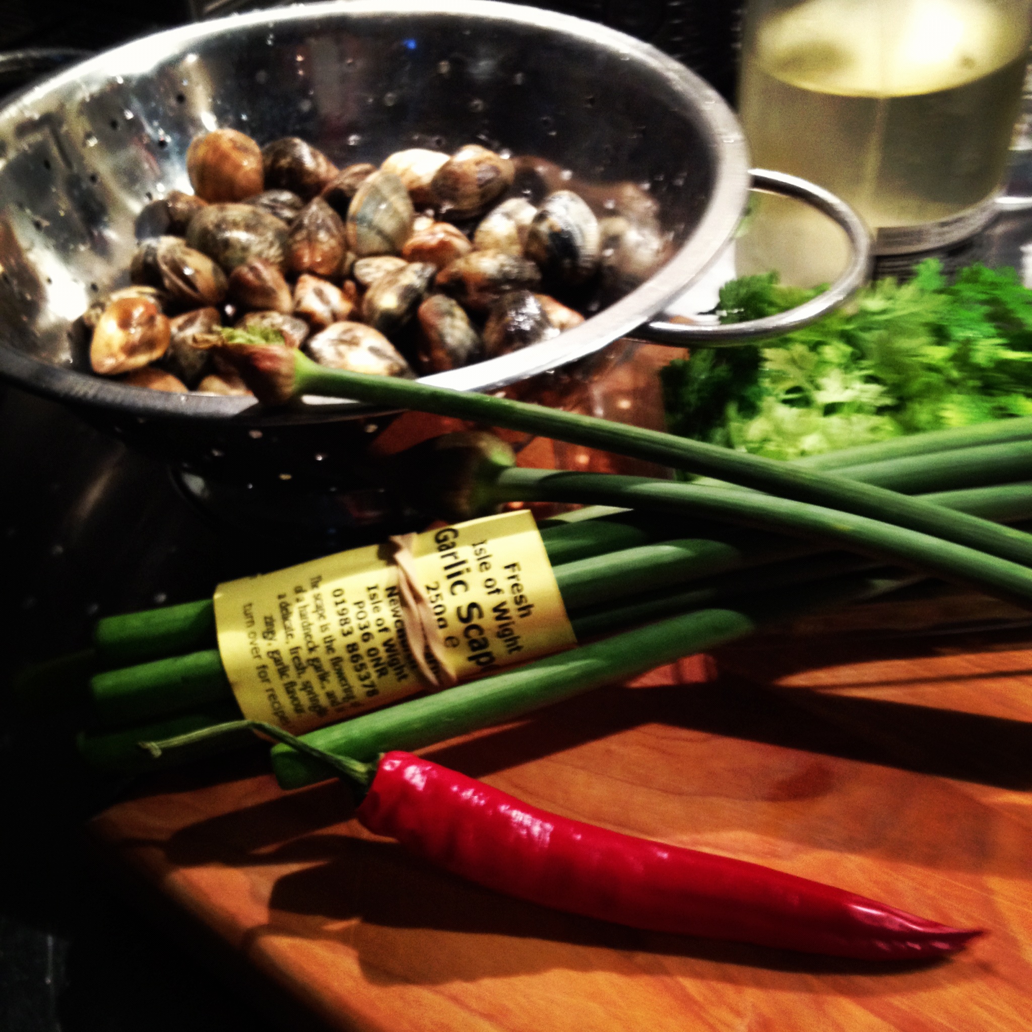 CLAMS WITH GARLIC SCAPES AND CHILI