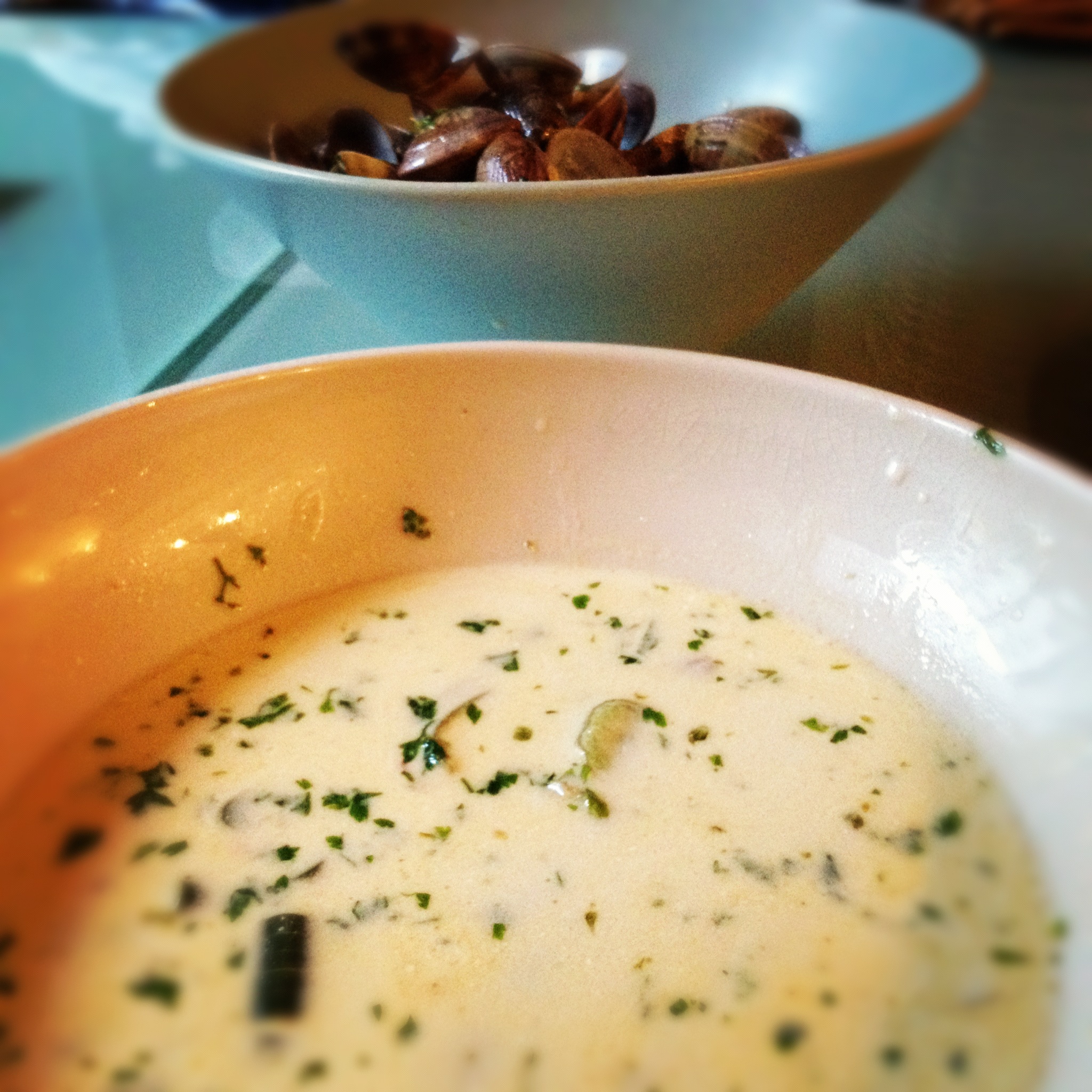 Now that isn’t quite the scenario that led to tonight’s dinner adventure. Yesterday’s shopping trip as you know was done with the aim of seducing the man who needs to fall in love. I was thwarted by Euro 2012. In my despair I did write him a rather horrible email so I’ll probably never hear from him again. Which is a shame. As I do rather like him…but anyway, back to the food. I had enough clams to make a small first course for two people. With that no longer an option and clams now 24 hours old, the whole lot had to be cooked and eaten. I also found some garlic scapes (see the pic below). These are a kind of giant chive I suppose which look a bit like you’re buying a bunch of daffodils. I’ve never seen them on this side of the Atlantic and I’ve certainly never cooked them but I figured that they’d work with the clams. I also added white wine, chili and a sprinkling of chervil at the end. And oh yes, a bit of a glug of cream. Well in needed using up…