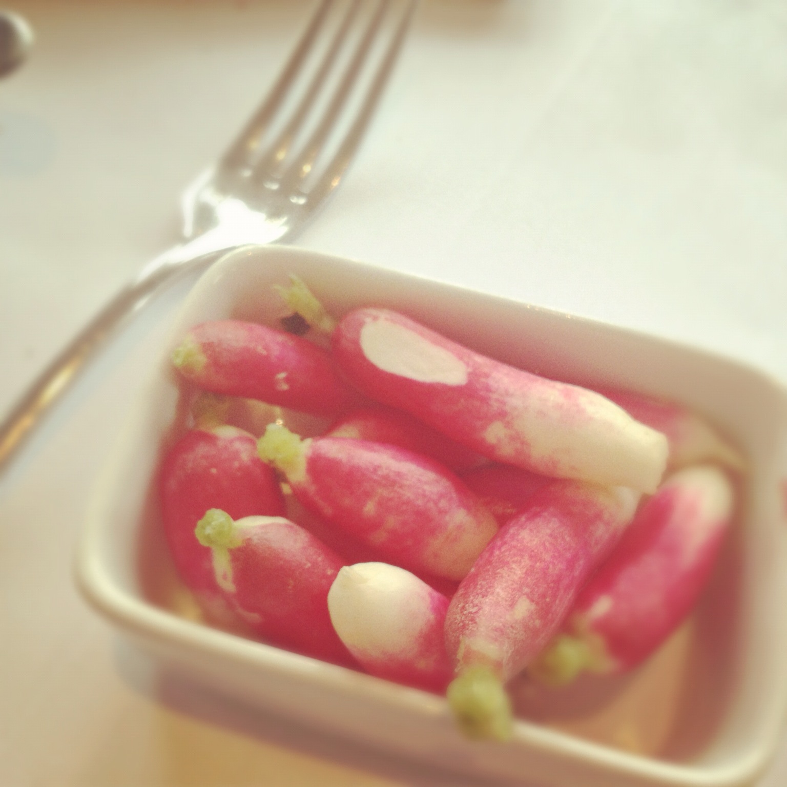 Not really. Anyway, on to food. I was going to go to the cinema today but didn’t read the programme correctly so the movie I wanted to see wasn’t on. But as I was in Whiteleys and hungry the siren call of Rowley Leigh echoed through the half-rented mausoleum of mammon. So from the Odeon to Cafe Anglais I travelled. Two things I love about Cafe Anglais. Radishes and windows. Lots of light pour in through the elegant leaded panes. All the better by which to slather the radishes with sweet butter and a sprinkling of sea salt.