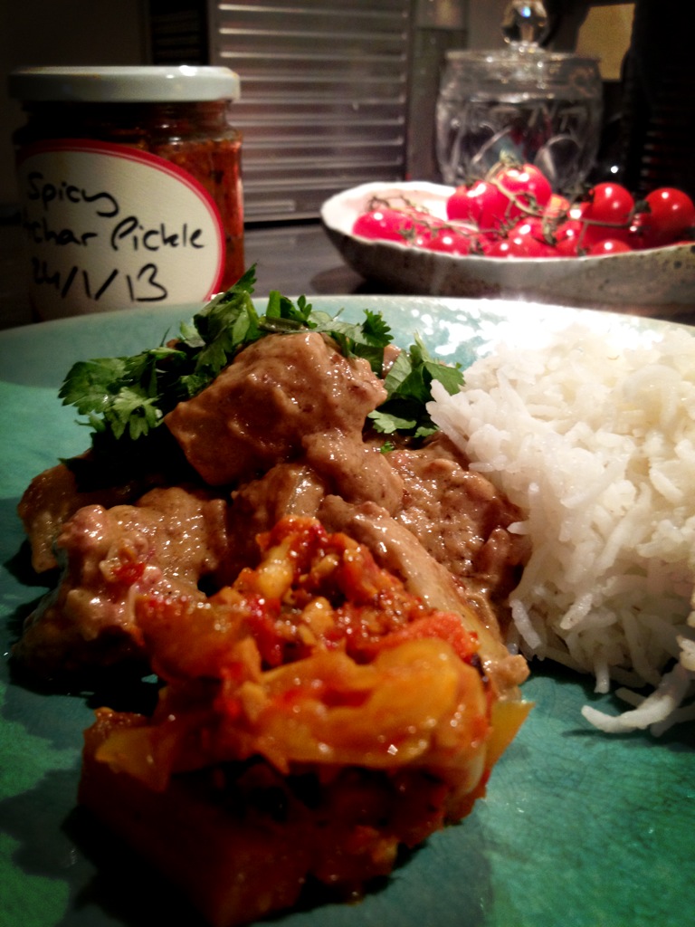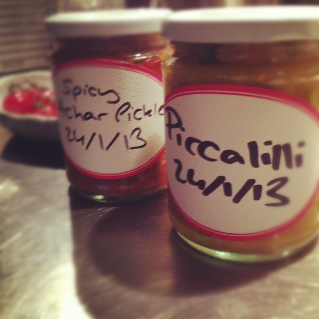 The twitterverse is a wondrous place. It has introduced me to dozens of lovely characters (in 140 characters or less) one of whom is Andre Dang (@andredang) a rather splendid person whom I have only met in real life the once, but feel as though I know rather well. But it was still a lovely surprise when he made good on a passing tweet and sent me some of his prototype pickles. A piccalilli and an achar. Now, I like piccalilli but I love achar. It’s a fresh pickle made from crunchy vegetables and chill used as a condiment across South East Asia, a part of the world of which I am unduly fond. More of this later.