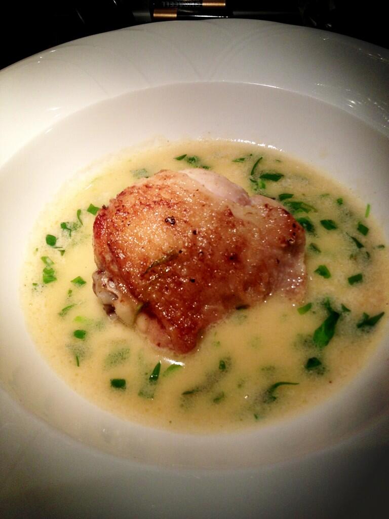 - At the last minute add chopped tarragon. Place the chicken thighs in deep dish and pour the sauce around the chicken.