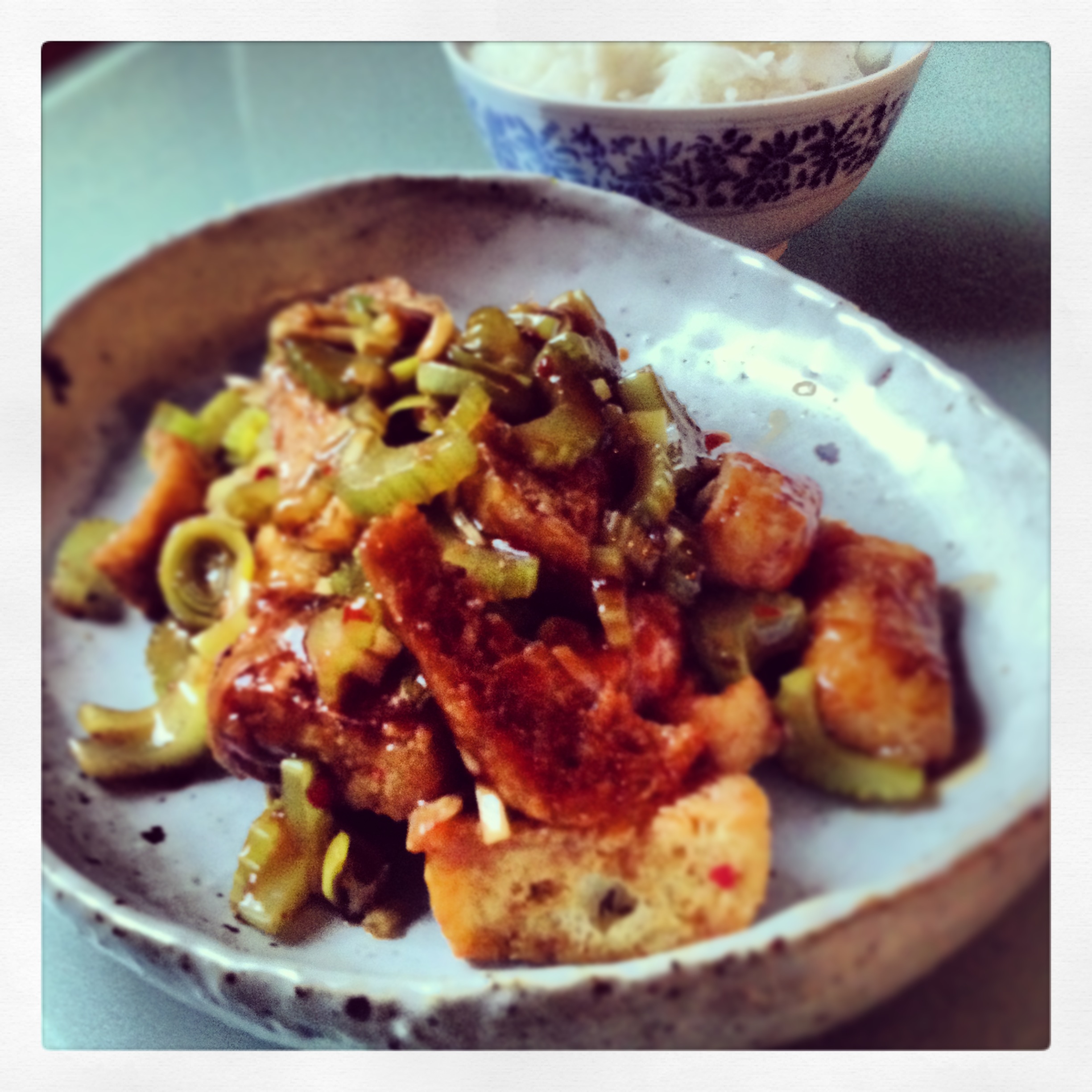 There can’t be many ingredients less loved than tofu and celery. I don’t share the loathing. Celery is one of those long lasting veggies that can survive the singleton’s fridge. Ready fried tofu I buy at my local Thai supermarket and keep it in a zip loc for a couple of weeks. I really like the spongy texture which soaks up sauces in direct defiance of those who accuse this most versatile of ingredients of blandness.