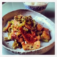 The sauce for this dish is inspired by Fuchsia Dunlop’s Fish Scented Aubergine – a recipe cooked by all those sensible enough to buy her most recent book: Every Grain of Rice. In it she explores the food of the every day kitchen tables of a broad swathe of China. Much of it is vegetarian, so I hope she will approve of this homage. There is no fish by the way…but this saucing is often used for fish, hence the name. I’ve added some rice wine as I love the deep savoury flavour it brings. I had run out of fresh ginger – a finely chopped teaspoon full would definitely enhance it…but the celery has a real strength of character so I don’t miss it at all.