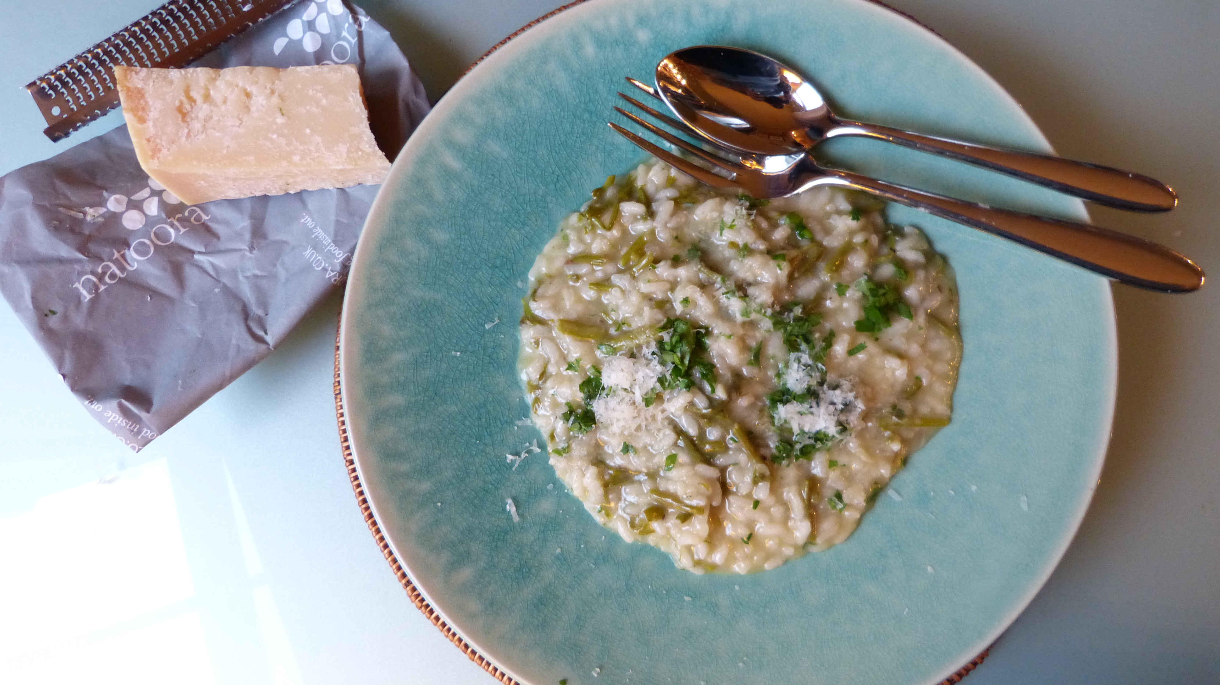 But if Easter teaches us anything, it is that we all have our crosses to bear and we all need to count our blessings and the joy of good food is one of them. Thankfully on Maundy Thursday, when the 4 days loomed in front of me, a box arrived in my office. Not filled with chocolate. Something far better and I knew that because the outside of the box had on it one word – Natoora. For those not familiar, Natoora is a premier importer of fine foods. They’ve just a launched a new service in conjunction with Ocado called “One Special Dish” in which they send you an ingredient they wouldn’t normally sell on Ocado, paired with additional ingredients you need to make one dish. This comes with a handy together recipe card at what I assume is a slightly discounted price. This month the ingredients were for Bruscandoli Risotto.