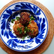 5. Roll each ball in the polenta and drop into the heated oil. It will spit so have a splash-guard standing by.